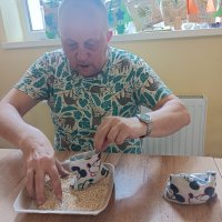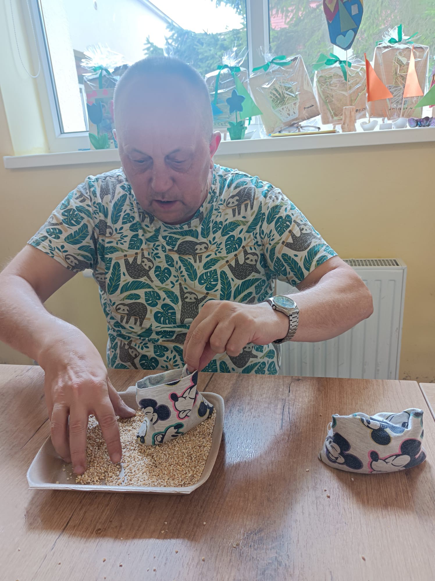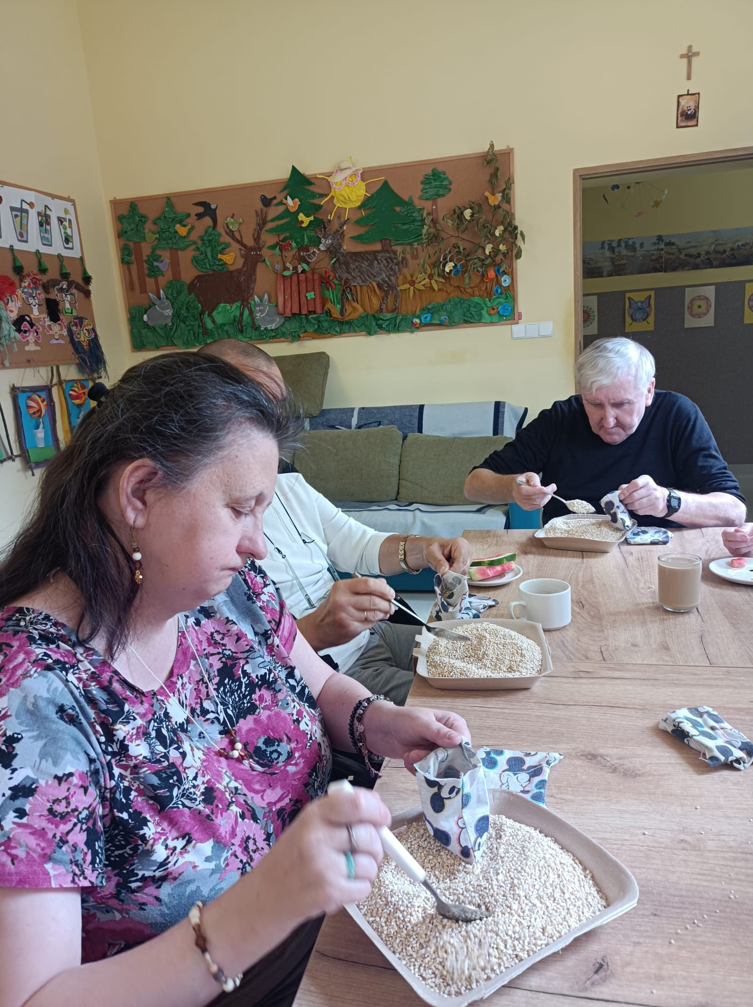 Podczas zajęć w naszym Domu Pomocy Społecznej mieszkańcy mieli okazję spróbować swoich sił w szyciu małych woreczków wypełnionych kaszą. Każdy krok – od przygotowania materiału, przez zszywanie, aż po wypełnianie – wykonywany był z dużym zaangażowaniem i uśmiechem.