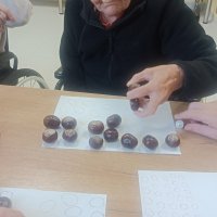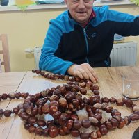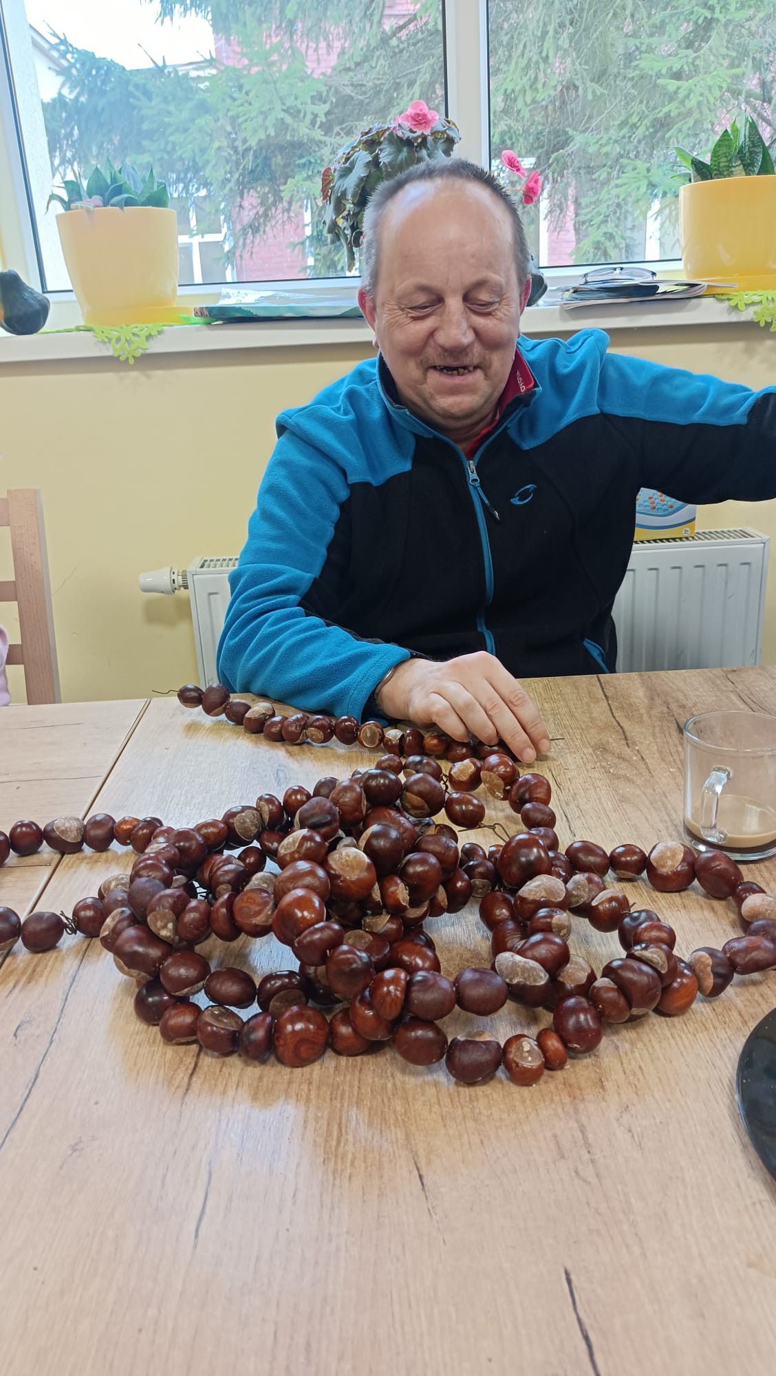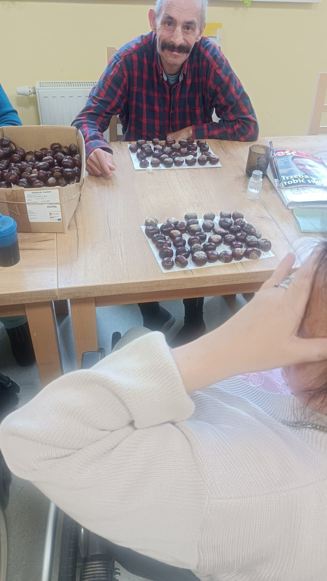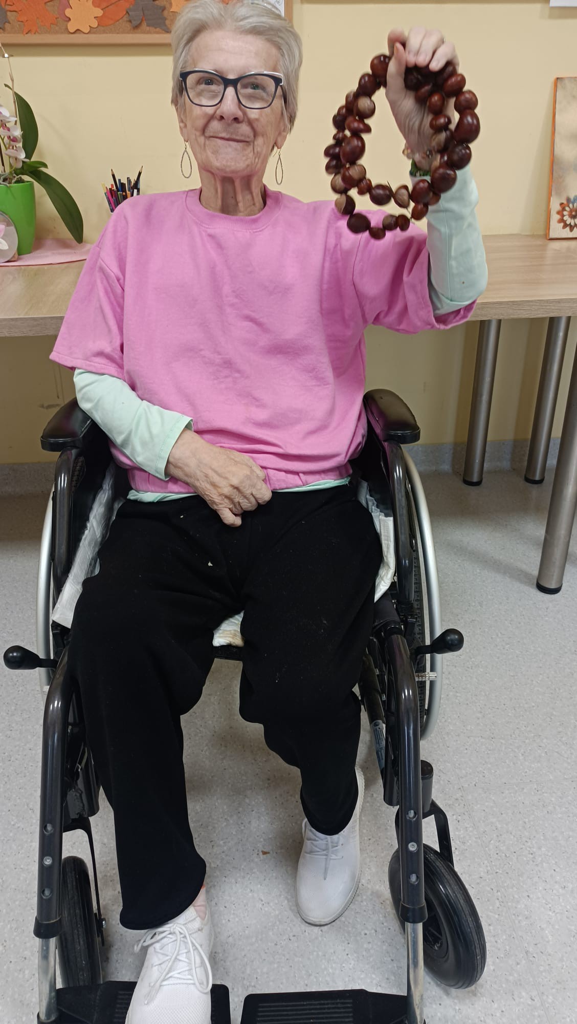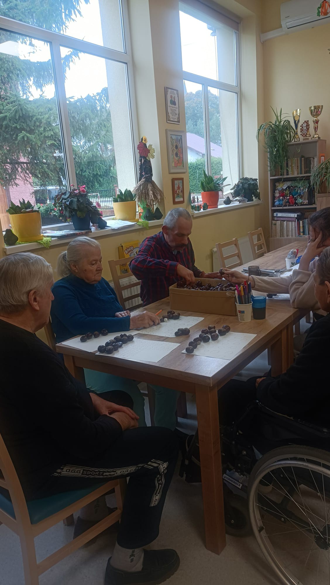 Nasza kreatywna terapeutka przygotowała również specjalną grę z kasztanami, która dostarczyła mieszkańcom mnóstwo radości i śmiechu. Podczas tworzenia nie zabrakło dobrej zabawy, współpracy i rozmów przy aromatycznej herbacie oraz kawie.